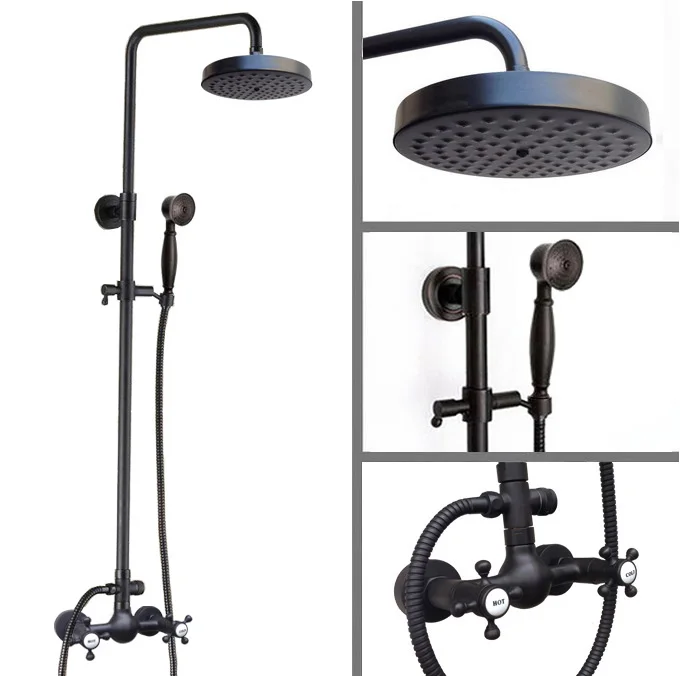 BEST Black Oil Rubbed Brass Dual Cross Handles Bathroom 8 Inch Round Rain Shower Faucet Set Bath Mixer T