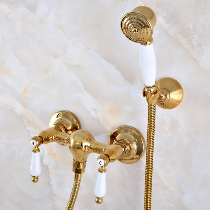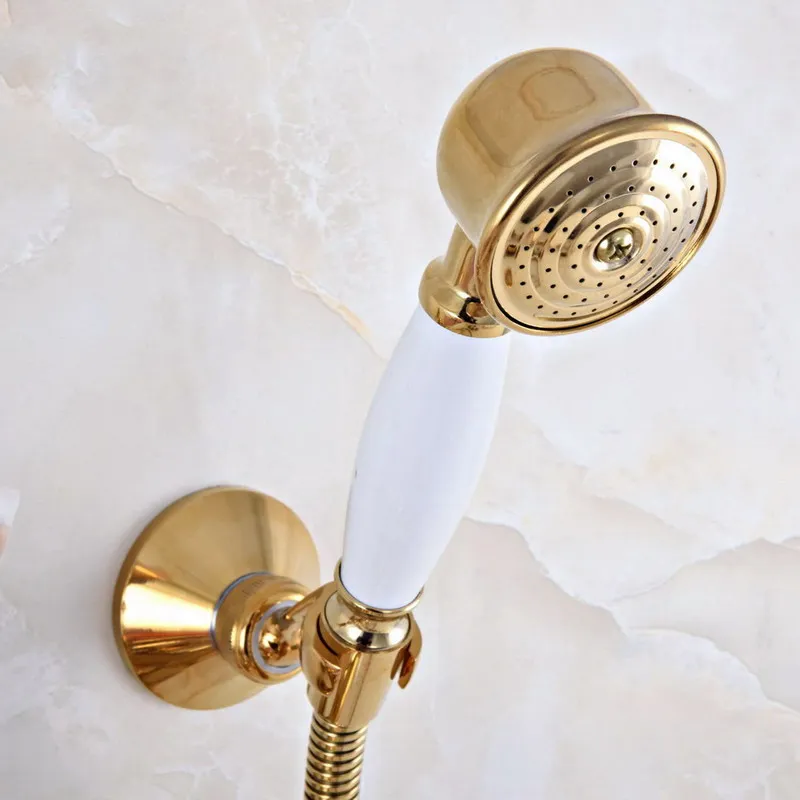 Luxury Polished Gold Color Brass Bathroom Hand Held Shower Head Faucet Set Mixer Tap Dual Ceramic H