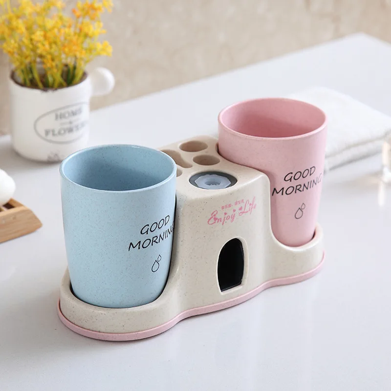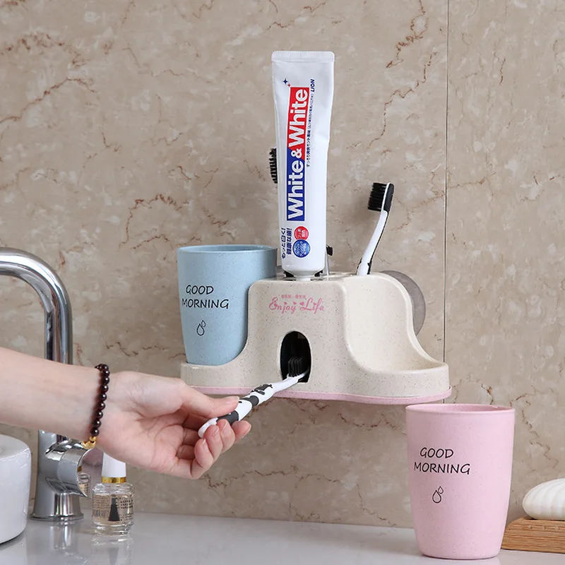 BEST QUALITY Automatic Squeeze Toothpaste Suction Type Toothbrush Rack Couple Mouthwash Cup Toothbrush Rack Set