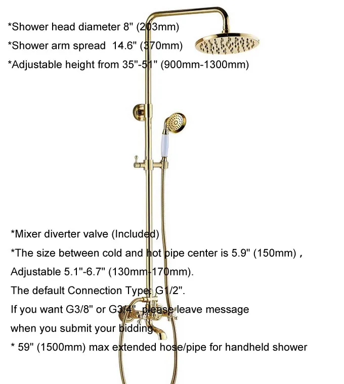 Luxury Golden Bathroom Shower Mixer Taps Wall 8" Rainfall Bath Shower Faucet Set W/ Handshower Tub